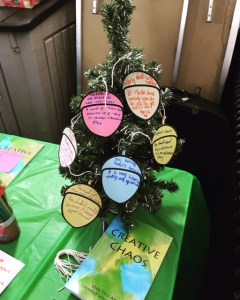 Last Saturday I attended the launch of the Oak Tree Arts young writers book, ‘Creative Chaos’, which includes the winning entries from the poetry competition I helped to judge. It was great hearing the winners read out their work to an audience of parents and friends. I loved the fact the woman who runs the group, Sue, asked them to write their favorite books on decorations to hang on their tree. A picture of this and the book is below. You can check out the Oak Tree Arts website here They meet every Saturday at Abbey Books in Paisley and Sue does a lot to encourage young writers.
