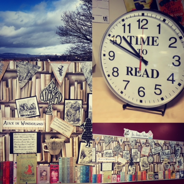 The librarian has decorated the school library with all sorts of wonderful creative displays. I took a photo of some of the Alice in Wonderland ones (below), and the fantastic clock.