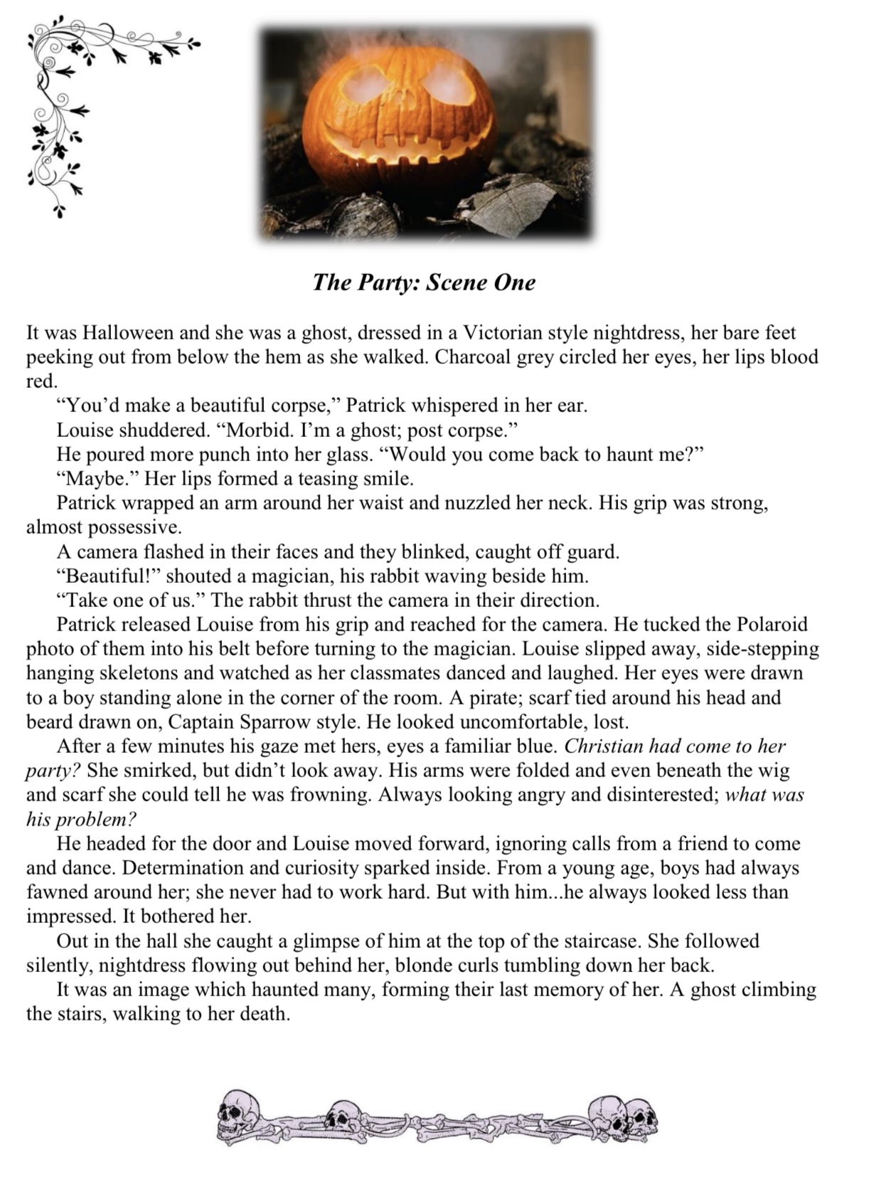 As my Young Adult mystery (not a horror) Promise Me features flash-back scenes to the night of a murder at a Halloween party I decided to create a PDF doc with graphics and a preview of the first few chapters. I’ve posted a pic of Scene 1 below and you can read the rest of the free extract here.